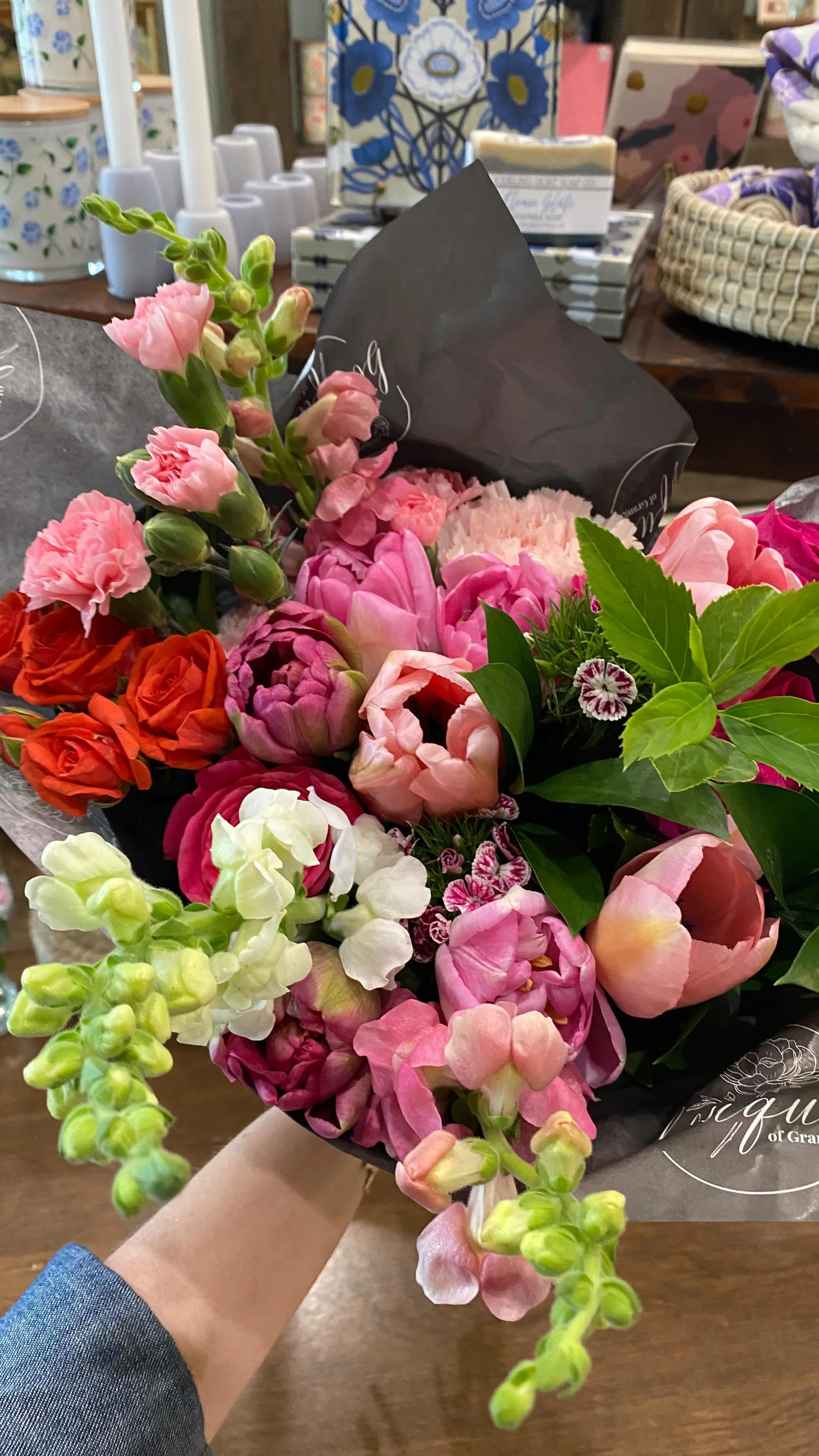 Our Wrapped Bouquets are carefully crafted by our florists in our Granger flower shop, and feature seasonally inspired flowers. We finish these bouquets by wrapping them in our custom tissue paper, then add a delicate bow for a stunning gift that is sure to put a smile on their face.