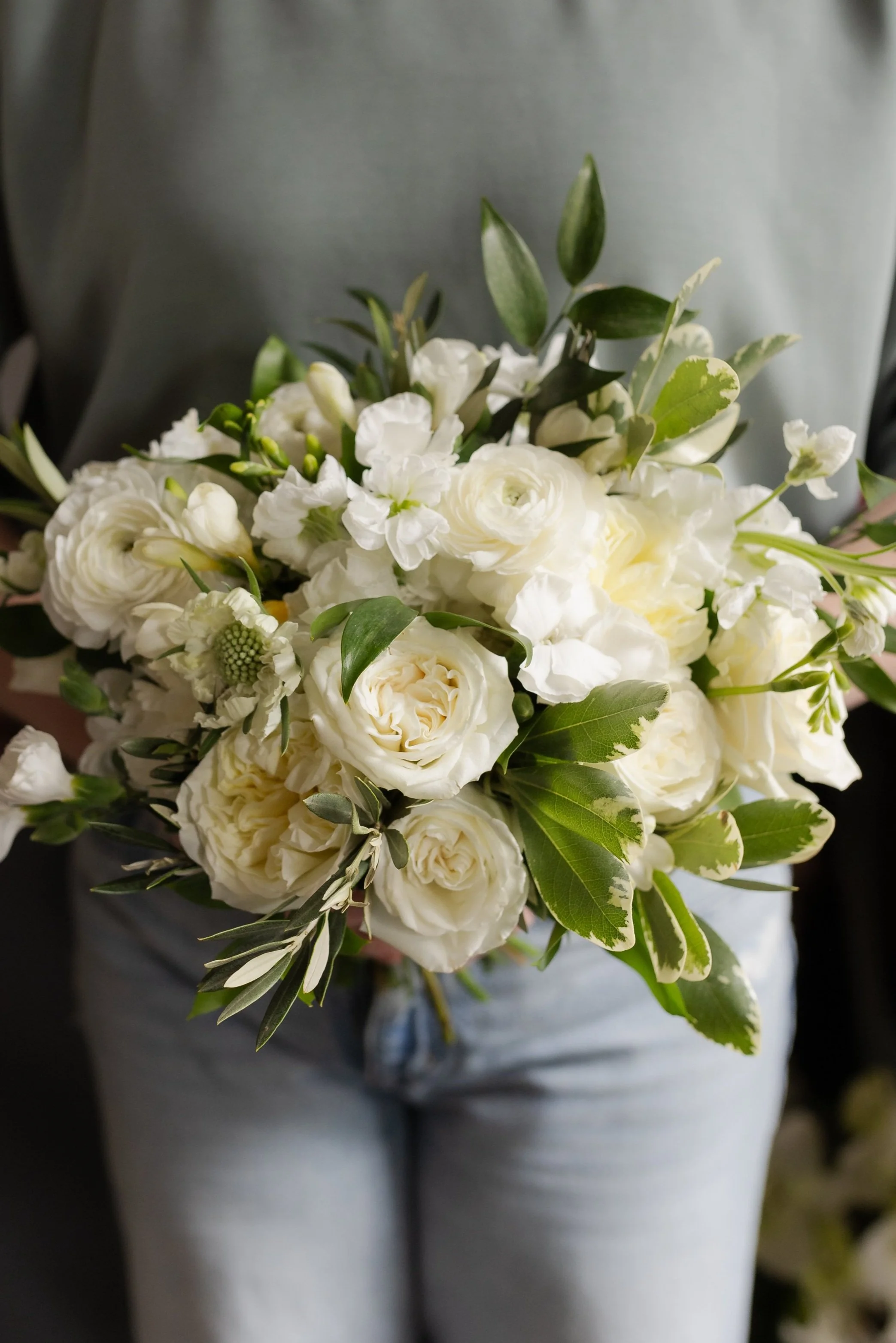 Our wedding floral options include bridal and bridesmaid bouquets, boutonnieres, wrist corsages, flower girl baskets, and centerpieces, all created within your selected color palette in our signature style.