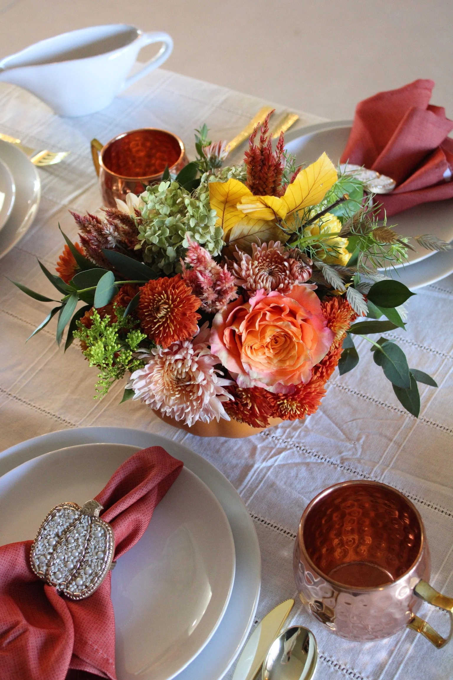 A good rule of thumb when it comes to choosing a color palette is the 60-30-10 rule, 60% of a base color, 30% of a secondary color, and 10% of an accent color. I always like to think of a neutral, and tie in a deeper color and a metallic accent. For Thanksgiving, you may opt for a tan or cream base color, with a burnt orange or plum secondary color, and a gold or bronze accent. For Christmas, the typical reds and greens, or an elevated navy and black with silver or gold accents.